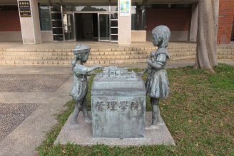 此件雕塑落在管理學院前庭入口之紅磚道上,兩位幼童與檯座上的大樓模型,產生一種有趣的"對話"和"牽情"。神情自若的幼兒駐足在此好奇地端視眼前的模型,在公共場域中,讓行經至此的人,不免也想靠近來一探究竟,這是一種"牽情"的作用引導引觀者主動親近且溫馨的公共雕塑作品。除了具有藝術性的表現,同時也兼具管理學院的意象宣傳效果。