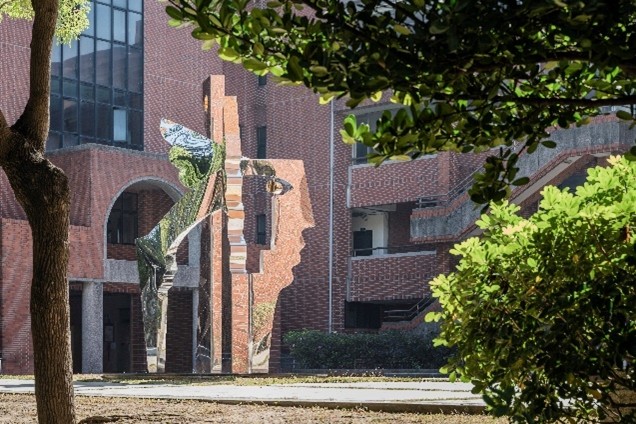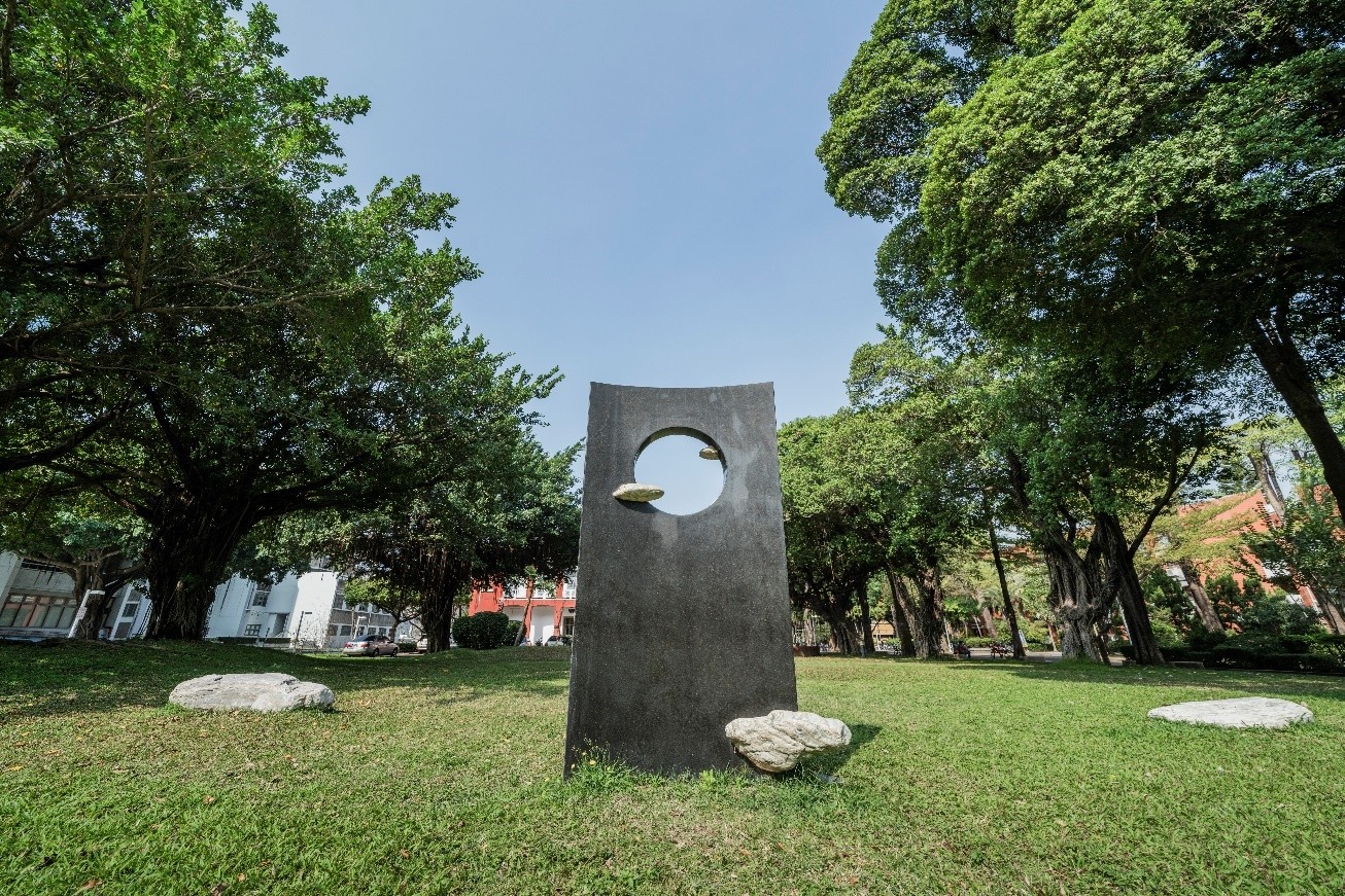 座落在校園道路小圓環中的〈浮雲樹影-風刻痕〉,環抱 於天空、綠樹、光影之下。作品有著粗糙的肌理觸感,銳利的刀法切面構成其輕盈的造型。