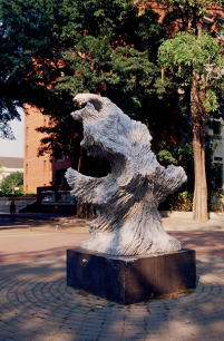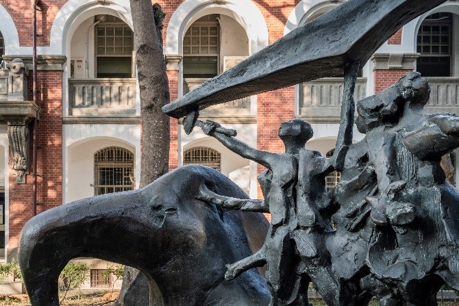 作品表現兩人對招,同時出手飛躍騰空,呈現攻勢,攻中有守,極具動感。在動中求平衡,呈現出來的氣勢與神韻,以及量塊與線條之間的造型美感,兩座雕像互相呼應;由內而外表達「大開大合」、「吞吐洪荒」的生命力,與成大人不斷在學術上切磋砥礪的精神不謀而合。